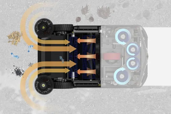 Snažna metilica - ključna karakteristika Combimac-a Combimac poseduje visokoefikasan sistem za metenje sa: Dve bočne četke koje usmeravaju prljavštinu i čvrste ostatke ka centralnom delu mašine Dvostrukim cilindričnim četkama koje rotiraju u suprotnim smerovima (bez potrebe za prednjim poklopcem) Šta može da pokupi: ✔ Sitnije čestice (prašina, listje) ✔ Veći predmeti (limenke, flaše) ✔ Teži ostaci (kamenje, drveni delovi, voće) Praktično odlaganje: Sakupljajući bunker sa hidrauličnim klipovima za jednostavno pražnjenje Ova konfiguracija omogućava rad bez zaustavljanja čak i u zahtevnim uslovima.