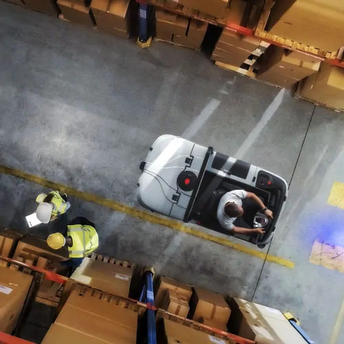 Plavi sigurnosni reflektor koji projicira svetlosni snop na pod, unapred upozoravajući na prisustvo mašine.