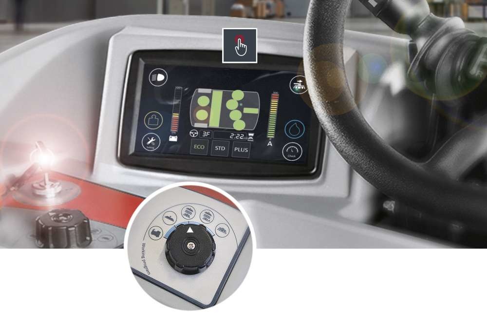 COMFORT Korišćenje modela C130 je tako lako i intuitivno, samo sa dugmetom i novim ekranom osjetljivim na dodir Selektor radnog programa omogućava rukovaocu da odabere vrstu aktivnosti koja se obavlja: čišćenje i sušenje, čišćenje i sušenje pomoću pokretne glave četke, samo čišćenje ili samo sušenje. Željeni program čišćenja se aktivira preko ekrana osetljivog na dodir: ECO, STANDARD i PLUS. Svaki program koristi određenu količinu vode, deterdženta i pritiska, tako da možete izabrati pravi izbor za specifične uslove čišćenja.